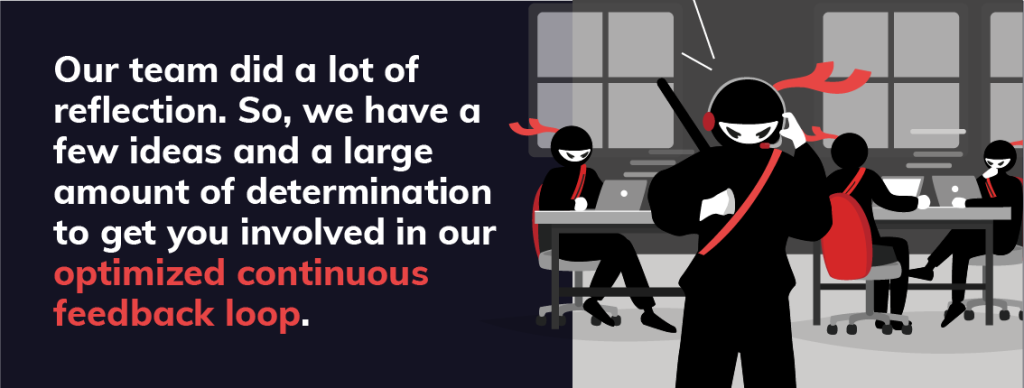 We want to get back on track with our user-centric thinking. Your feedback means a lot to us, so we are establishing a better feedback loop on our feedback page. Our team did a lot of reflection. So, we have a few ideas and a large amount of determination to get you involved in our optimized continuous feedback loop.