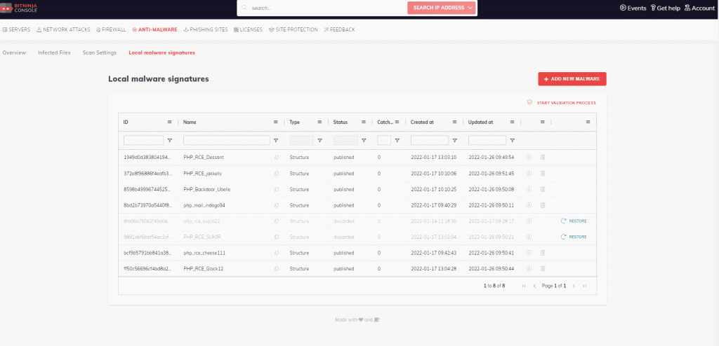 You can create your own user level signatures on the Local Malware Signatures page.This is useful in many ways: you can detect infections that are not catalogued in BitNinja’s database, and if you are being targeted by a specific type of malware, you can fight it head-on. You can also publish malware files on your own servers that you believe are dangerous.
